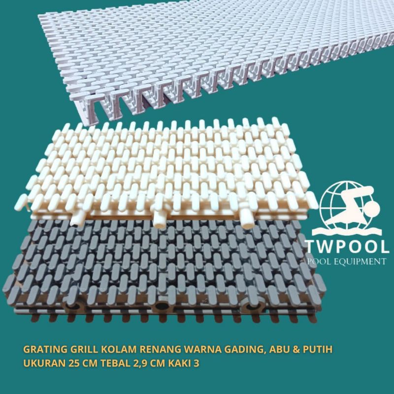 Grating grill kolam renang dengan panjang 25 cm kaki 3 berguna untuk penutup saluran pembuangan air pembatas kolam renang tempat wudhu taman dll.untuk harga kita per 3 meter.order dibawah 3 meter bisa chat dan info ke kami.untuk pilihan warna * putih* abu* gadingukuran 25 cm ketebalan 2,5 cmbahan dari plastik Abs kuat kokoh.berat per meter 3,5 kg.note: * untuk pemesanan barang ditanya terlebih dahulu untuk stocknya.* free ongkir untuk area dki sekitarnya minimum pembelian 30 meter dan belum termasuk ongkir luar kota* ongkir antaraja dan sicepat hanya untuk resi dan formalitas.* pengiriman luar kota bisa menghubungi kami untuk pilihan ekspedisi yang murah dan volume kita akan rubah jadi ongkir di shoppe lebih murah happy sho