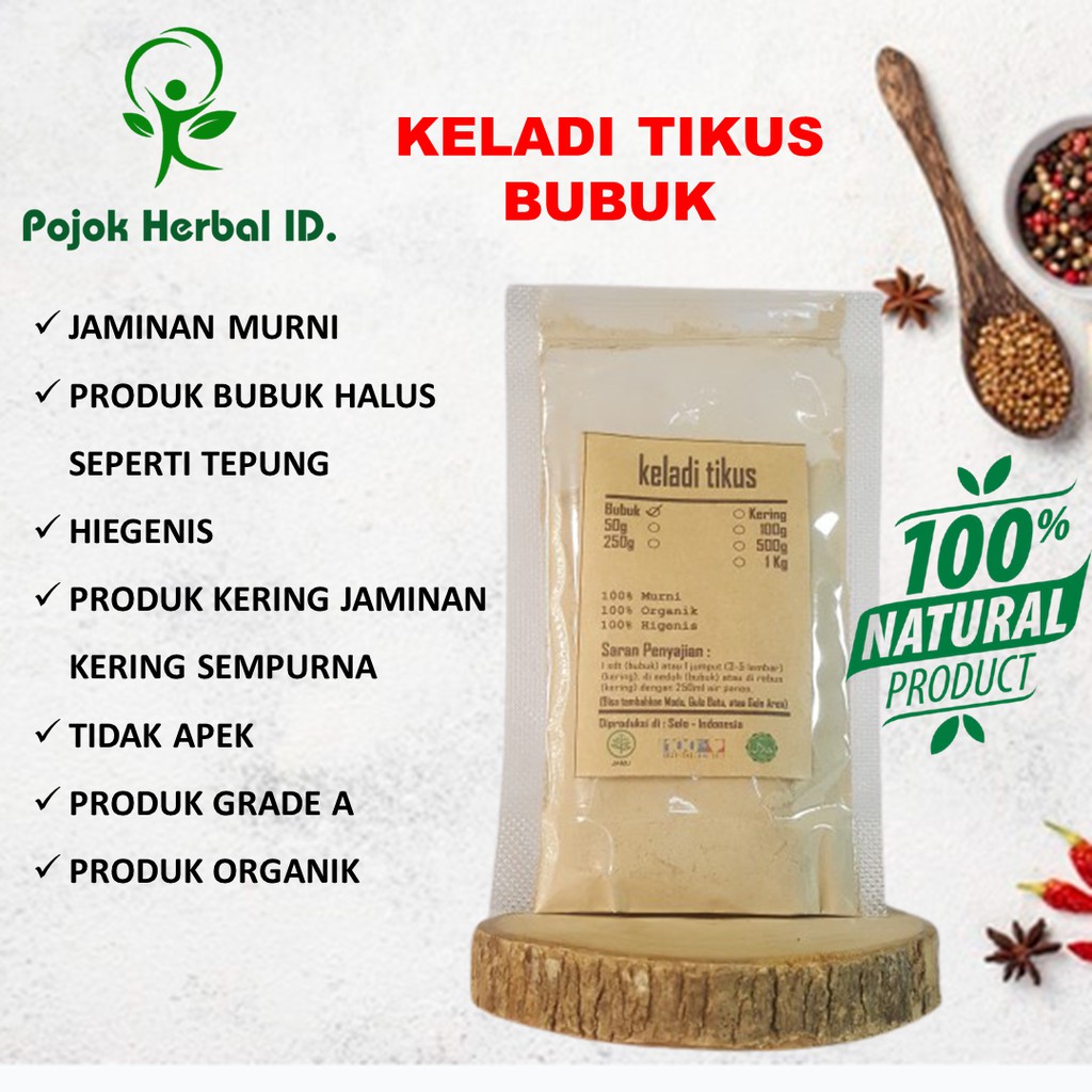 POJOK HERBAL ID - JAMINAN PRODUK TANPA CAMPURAN - KUALITAS PREMIUM - BUBUK HALUS (BUKAN SERBUK)Produk yang kami jual SELALU READY STOK.Berat bersih / netto : 100 gramKeladi Tikus Bubuk Sangat Bermanfaat untuk : 1. Menghambat Dan Menyembuhkan Sel Kanker2. Detoksifikasi3. Menangkal Radikal Bebas4. Bisul Yang Membengkak5. Sebagai Anti BakteriCatatan: Untuk mempercepat proses pengemasan,produk yang sama,akan kami jadikan dalam satu kemasan.Jika ingin terpisah harap diberi catatan saat proses orderTerima Kasih#KELADI