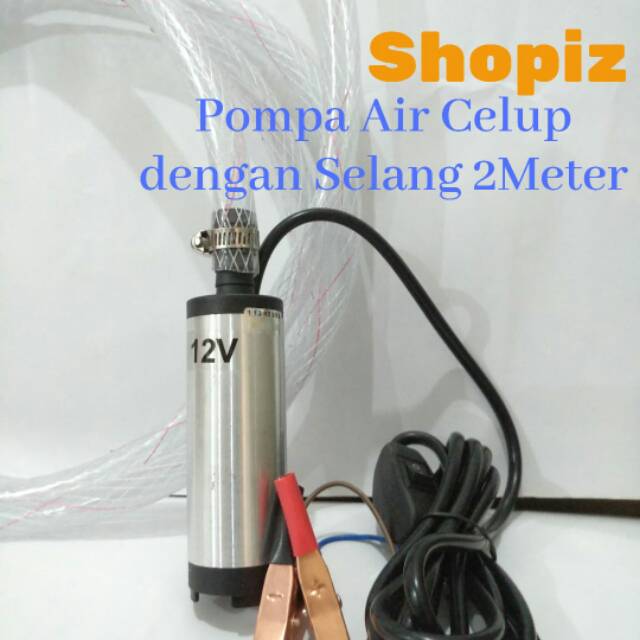 Pompa Air Celup Mini DC dengan Selang 2meterPompa Celup serbaguna, berukuran mini dengan motor yang kuat dan kencang, terbuat dari Stainless Steel, PVC dan Waterproof: aman utk air konsumsi, solar dan cairan lainnya.Banyak dipakai utk:1. Menguras akuarium2. Mencuci mobil, motor dan AC3. Menyiram bunga dan tanaman4. Jualan minyak tanah eceran5. Boat dan perahu yg kemasukan air6. Mengisi solar dari jerigen/drum7. Kran air Reservoir/WC umum Portable8. Dispenser/galon air tanpa listrik PLN9. Menguras genangan air akibat banjir10. Bisa dikombinasikan dgn Arduino utk otomatis11. dan masih byk fungsi lainnyaPower supply cukup 12v DC dari:1. Aki/Accu2. Adaptor AC/DC3. Step Up dari batere Kotak 9v/186504. Step Up dari charger USB HP dll**Spesifikasi:Tegangan kerja: 12v DCKecepatan motor: max 8500 RPMDebit: 12 ltr/menitHead: 2.5mKabel: 0.5mm x 3 meterDiameter output: 19mmDiameter input: 38mmMaterial: ABS + stainless steel**Perhatian:- Jangan dipakai tanpa air- Jangan terbalik pemasangan positif dan ne