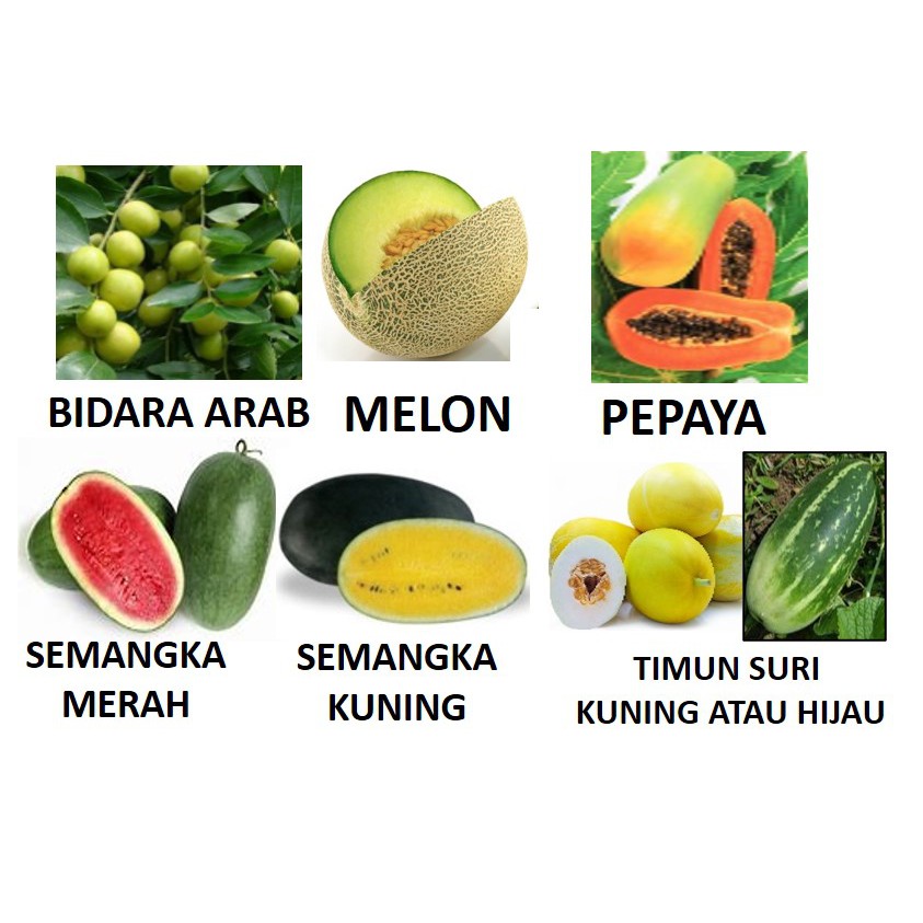 PAKET BUAH-BUAHAN (6 Jenis Buah) :1.Buah Naga (10 Biji) atau Bidara arab: 5 Biji (tergantung stok)2.Melon: 5 Biji3.Pepaya California: 3 Biji4.Semangka Inul Merah: 4 Biji5.Semangka Kuning: 4 Biji6. Timun Suri 20 BijiNote. Benih bidara klo mau ditanam jgn lupa buka cangkangnya ya kaBonus:- Pupuk npk 16.16.16 = 80gram- polybag uk. 10x10- langkah-langkah umum penyemaianExp: Rata rata Sekitar 18 bulan atau 24 Bulan dari Bulan ini