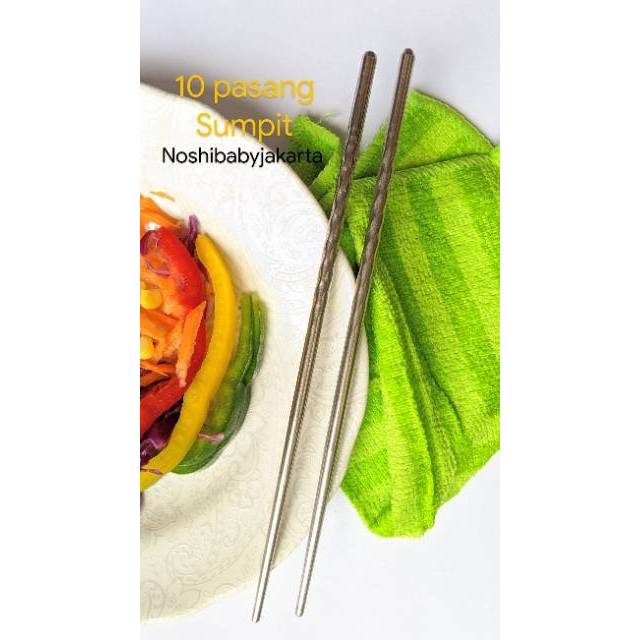 Sumpit stainless isi 10 pasangPanjang 22 cmStainless Steel Chopsticks / sumpit stainless steel polos dengan ulir di bagian atasBahan : Stainless Steel - ringanBerat Nett : 165 grTinggi : 22 CmKemasan : Wraping PackDimensi : 1.5 X 11.5 X 30 cmBerat Packing : 220