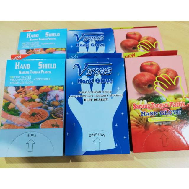 DIKIRIM RANDOM!!!!Sarung tangan.Sarung tangan plastik steril sekali pakai yang terbuat dari bahan polyethylene yang tidak beracun dan anti alergi. Sarung tangan ini berfungsi melindungi tangan Anda dari bahan-bahan kimia selama kegiatan mencuci, atau menjaga makanan tetap bersih bila Anda mempersiapkan makanan. Selain itu, sarung tangan ini sesuai dipergunakan juga di lingkungan rumah sakit, salon, atau rumah makan.Bahan : HDPE (Tidak mudah robek).Fungsi : Multi Fungsi (industri, restaurant, rumah tangga, rumah sakit, klinik, laboratorium, salon, hygienes, pabrik makanan, dll.).Isi : 1 pak isi 100pc = 50 pasang ta
