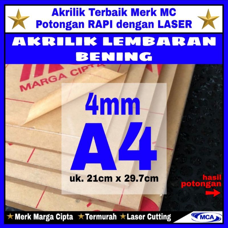 Acrylic Khusus Merek MC / Marga Cipta (Hi Quality Product)Pemotongan menggunakan Mesin Laser- Hasil pemotongan Rata, Rapi dan Halus- Akurasi ukuran yang presisiDESKRIPSI PRODUK :- Warna BENING- Ketebalan Akrilik 4mm- Ukuran A4 (21cm x 29.7cm)- Clear dan Transparant- Potong LASER (rapi dan presisi)CATATAN :- CHAT/ DISKUSI dahulu sebelum beli untuk konfirmasi ukuran pesanan dan waktu kirim.- Standar packaging akan kami sesuaikan dengan kondisi jumlah, ukuran pesanan dan jenis kurir.Kami Bantu Dengan Senang